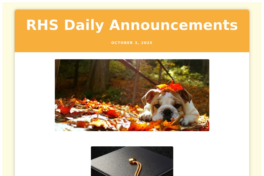 RHS Daily Announcements October 3, 2025 Student and Parent Information Junior and Senior College Fair October 9th. Sign up here! . . .