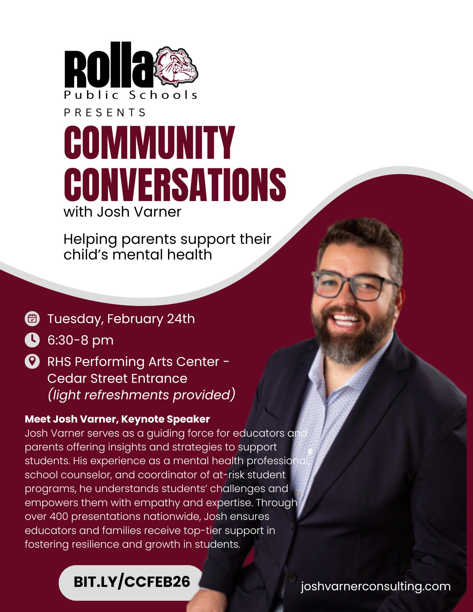 Join us for an evening of community conversations focused on student mental health. Our keynote speaker, Josh Varner, is a mental health professional with extensive experience in the school setting...