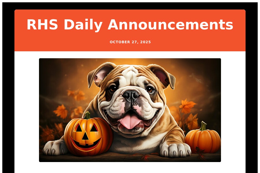 RHS Daily Announcements October 29, 2025 Student and Parent Information Halloween Costume Rules and Contest Info You are all welcome to dress up fo. . .