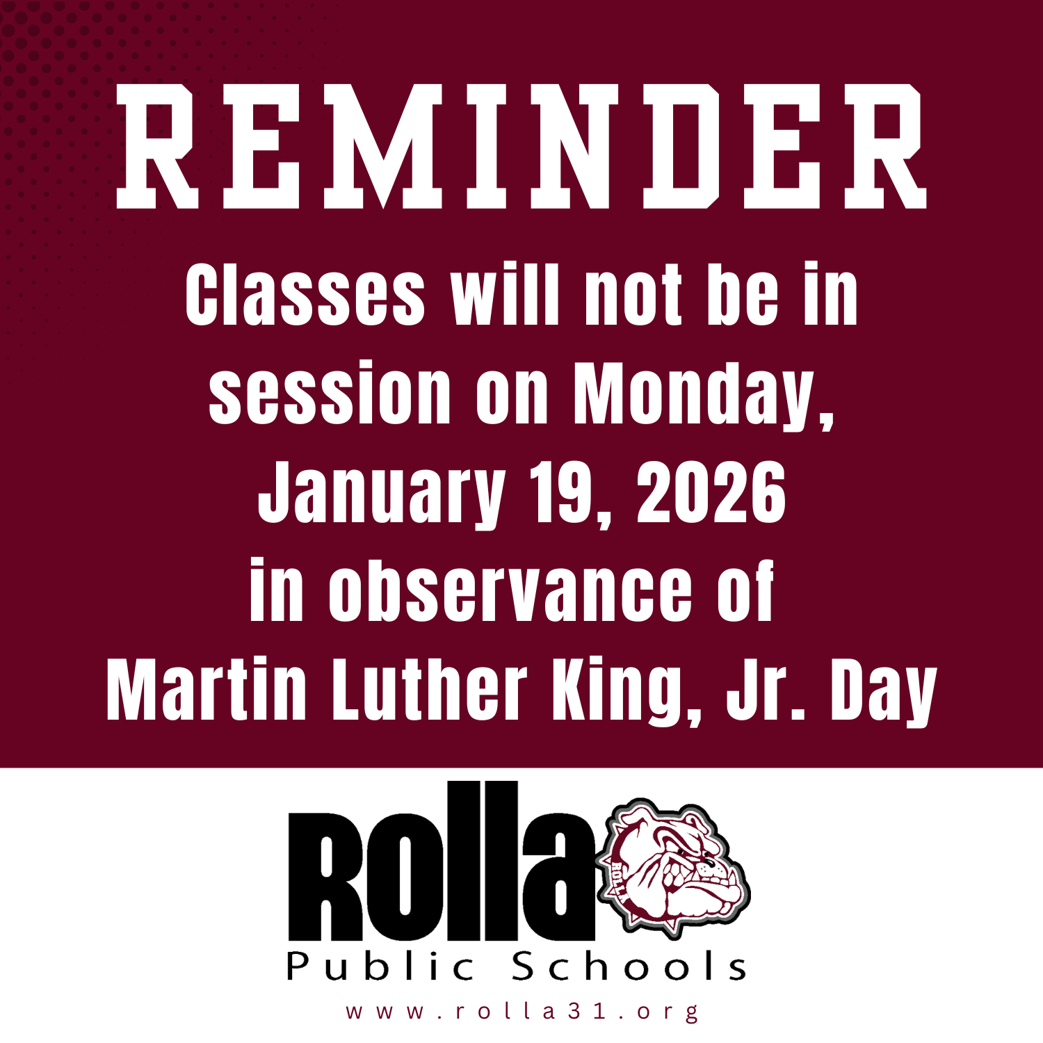 R31 Reminder: Classes will not be in session Monday, January 19th in observance of Martin Luther King, Jr. Day. Have a great weekend, Bulldogs!